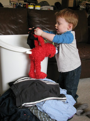 I will admit that we have started occasionally using this new interest to our advantage. For example, when Nicholas brings us a book we are completely sick of reading, we suggest he reads it to Elmo or Johnny instead. He happily complies, sitting up on the couch with them and "reading" the book. Melts my heart.